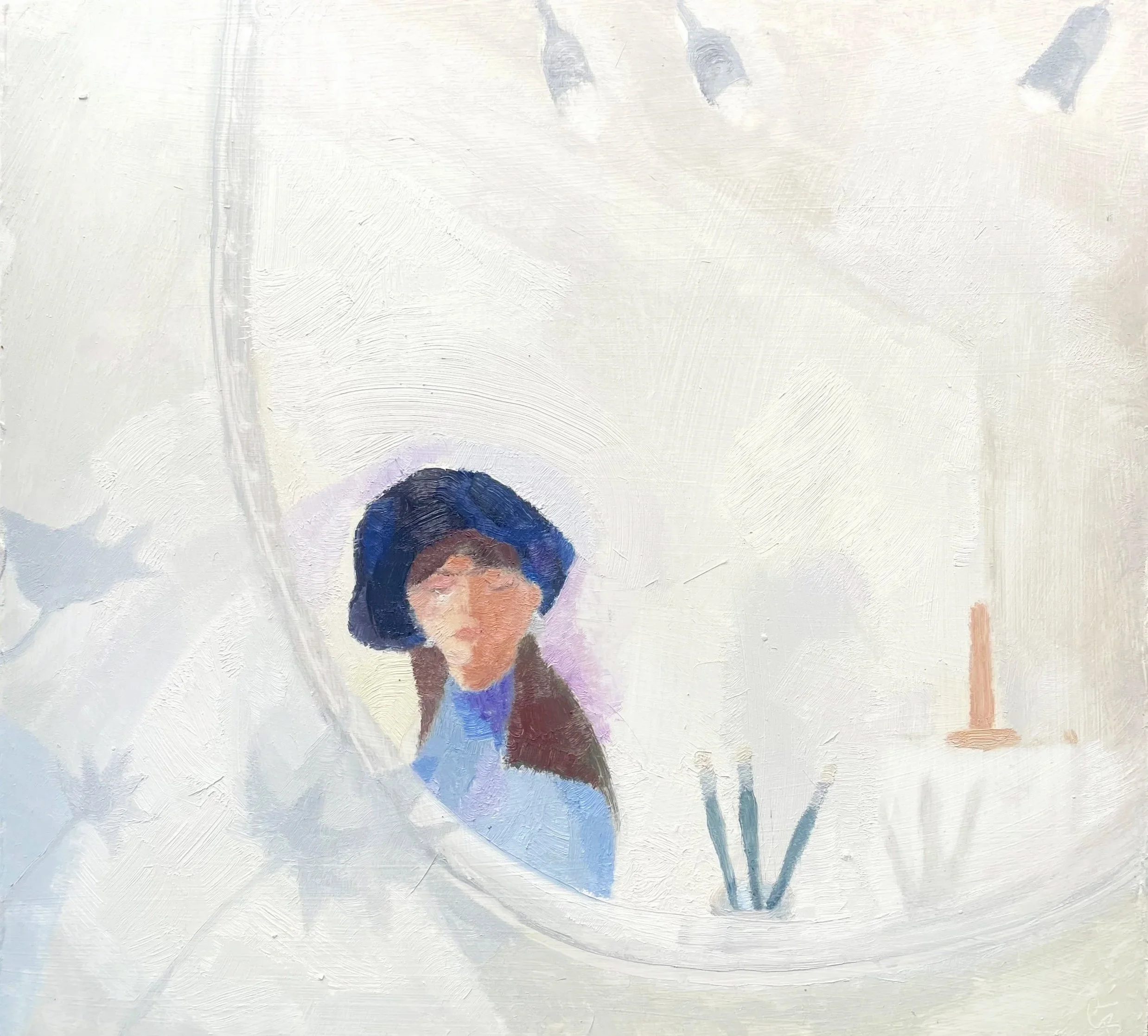 Working at this scale shapes both the making and encounter. The paintings ask for close attention and their surfaces bear the marks of a direct, gestural process. I work on board, holding the panel in my hands as I paint, completing each work in a single sustained session. The surface is scored into, rubbed back with a rag, and worked into with cotton buds. I am drawn towards a soft palette of whites and greys punctuated by fields of colour—tones informed in part by the chalk landscape of Dorset where I grew up.